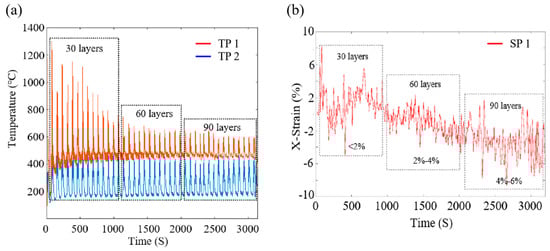 (a) Thermal history of 90 layers of deposition at TP 1 and TP 2; (b) accumulated strain of 90 layers of deposition at SP 1.