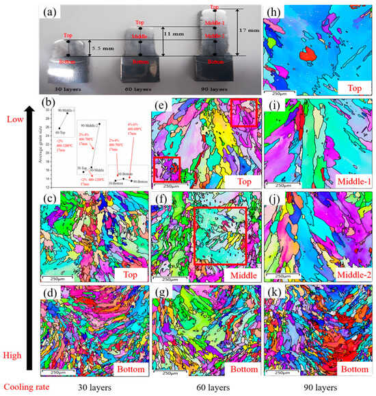 The change in average grain size in the three groups is shown in Figure 3b. After thermal cycles, the grain size improved to various degrees. Its variability depends on the accumulated strain and temperature caused by the thermal cycles, which leads to dynamic recrystallization and recovery. The grain size and grain boundary of nine regions are shown in Figure 3c–k, which indicates that the as-deposited microstructure display columnar dendrites accompanied by equiaxed crystals with a nearly random misorientation. This is typical in additive manufacturing [31,32]. As the bottom layer near the substrate has a greater cooling rate than other regions, this brings about a higher undercooling and nucleation rate [10]. Thus, the grain sizes in the bottom regions in the 30/60/90 layers are smaller than those in the middle and top regions, respectively. It is worth mentioning that from the image, the grain size of the top region of 30 layers is much smaller than that of the top regions of 60 and 90 layers, which may be due to the fact that the 60-layer and 90-layer sections have experienced more respective thermal insulation processes of the bottom layer. This is equivalent to the preheating effects [33], and reduces the cooling rate and increase the grain size.