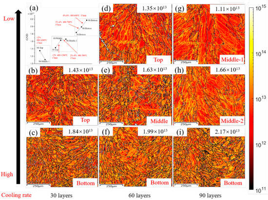 Figure 4b–g shows a comparison of GND for eight regions in the three groups, and the GND values are extracted for comparative analysis, as shown in Figure 4a. For the first group, with 60 layers at the top and 90 layers in the middle-1 section, the GND decreases slightly, from 1.35 × 1013 down to 1.11 × 1013, as shown in Figure 4d,g, which is due to grain coarsening caused by dynamic recrystallization, as mentioned above. Generally, the movement of dislocations cannot pass through the grain boundary [34,35]. The courser the grain, the smaller the grain boundary, and the worse its ability to capture dislocations [36]. On the other hand, 400–1200 °C high-temperature fluctuations would increase the movement ability of dislocations. Once the dislocations moving on different slip systems meet under certain strain, they undergo delivery and pinning, and the continuous pinning of dislocations causes dislocation stacking and gradually forms sub-grains [37], which are also an important source of GND [38]. As shown in Figure 4, the yellow lines interspersed in the grains increase the GND. However, in the process with 60 layers at the top and 90 layers in the middle-1 section, with 17 min thermal cycles, the accumulation of dislocations caused by sub-grains cannot completely supplement the annihilation of dislocations caused by the decrease in the grain boundaries. Thus, the GND of the 60 layers at the top is smaller than that of the 90 layers in the middle-1 section. For the second group, with 30 layers top at the top and 60 layers in the middle, the GND exhibits a rising trend to a small extent (1.43 × 1013 and 1.63 × 1013, respectively), which is opposite to that of group 1, as shown in Figure 4b,e. It is worth mentioning that although it is under the same conditions with 2% accumulated strain and a 400–1200 °C temperature fluctuation as group 1, the grain size changes only slightly. Therefore, the increase in GND is entirely contributed by the formation of sub-grains, and the GND formed at the grain boundary is basically unchanged. Then, for the 60 layers in the middle and 90 layers in the middle-2 section, an accumulated 2–4% strain is a key factor to bring about sub-grains, results in an improvement in GND and neutralizing the decrease in GND caused by grain coarsening. As a result, the GND remains stable, at about 1.65 × 1013, as shown in Figure 4e,h. For the third group, at a stable temperature fluctuation of about 400–600 °C and an increasing accumulated strain from 2% to 4–6%, the GND growth steadily increases from 1.84 × 1013 to 2.17 × 1013. This is due to the multi-point nucleation caused by the accumulated large strain and the grain refinement after dynamic recrystallization. The 90 layers at the top no longer undergo any thermal cycles in this experiment. In this section, the effect of the three groups with different numbers of thermal cycles on GND is discussed. Therefore, the 90-layer top is not considered.