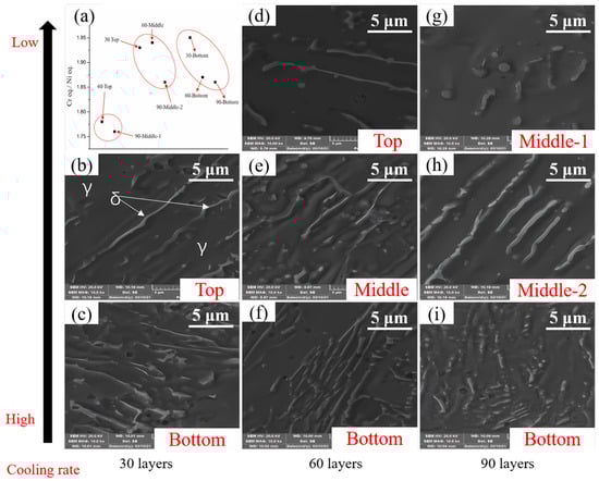 (a) The equivalents of Cr and Ni and their ratio as determined by SEM. (b–i) SEM images of the evolution of microstructures of the three groups of as-built samples.