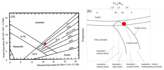 As mentioned in Section 3.3, δ-ferrite and γ-austenite are two common microstructural constituents in the solidification process of fast-cooled austenitic stainless steel, and their respective contents are determined by the solidification mode. This is based on Schaeffler and WRC-1992’s predictive graphs, as shown in Figure 6a, which only applies to austenitic stainless steels with a ferrite content between 0 to 100%. According to the conventional Schaeffler diagram [46], the calculation method of Cr eq. and Ni eq. is shown in Figure 6b, and the Cr- and Ni-equivalents can be calculated by Cr + Mo + 1.5Si + 0.5Nb and Ni + 30C + 30N + 0.5Mn, respectively. When the Cr eq./Ni eq. ratio is between 1.5 and 2.0, the solidification mode of stainless steel is in the FA region, The values calculated in this work are within the range of this area, as shown by the red dots in Figure 6b, while it enters the AF region when the Cr eq./Ni eq. ratio is reduced to between 1.37 and 1.5. It is worthwhile to consider the role of the cooling rate in different locations in the three groups mentioned above at an increasing distance from the substrate sample, although the cooling rates applied from the deposition temperature to room temperature in the DED 316 L are high enough in all regions compared to in traditionally fabricated steels. The FA region contains γ-austenite and δ-ferrite, with different shapes (i.e., skeletal ferrite and lathy ferrite), which reveals the diversity with the change in the Cr eq./Ni eq. ratio. Furthermore, the δ-ferrite will reduce with the decrease in the Cr eq./Ni eq. ratio, although it will remain in the FA region. Austenite and austenite + eutectic ferrite are included until the AF mode, which have less δ-ferrite.