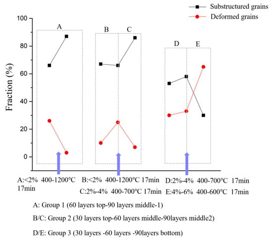 For group 3, the grains of the bottom sample of 30 layers are regarded as the initial grains, and these experience a 2–4% strain/400–650 °C temperature fluctuation for 17 min to create a 60-layer bottom sample, which then undergoes 4–6% strain/400–600 °C temperature fluctuation for 17 min to create a 90-layer bottom sample. The critical strains are 8.8% and 9.2%, respectively, which are greater than the actual strain. Dynamic recrystallization does not occur, and the grain size is almost stable (60- and 90-layer bottom). It can be seen that temperature is an important factor for recrystallization nucleation, and low temperatures would not promote recrystallization nucleation, even with an increasing strain energy input, as shown in Figure 3d,g,k and described in Section 3.2. Similarly, at the bottom of the three as-built samples, a large amount of δ-ferrite was formed during solidification (Figure 5), which provides enough pinning points for moving dislocations forming sub-grains due to appropriate strain and temperature, as described in Section 3.3 and shown in Figure 4c,f,i. It is also evident that the fraction of sub-structured grains increases, as in the dotted box D in Figure 7. What is more, under the relatively large strain (4–6%) condition, the formation of low LAGB comprised of regular dislocation arrays gradual transforms to HAGB. As a result, more LAGBs merge to form HAGB, which leads to a decrease in sub-structured grains and the promotion of deformed grains, as shown in the dotted box E in Figure 7, which also leads to the increase of GND. Therefore, GND increases after a 90-layer thermal cycle at the position of 90 layers from the bottom.