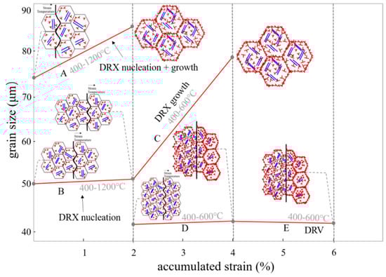 The accumulated strain in thermal cycles is actually caused by temperature fluctuations due to the expansion and contraction of the material. Thus, strain, temperature, and initial grain size are the three key factors affecting recrystallized grains. In the study of dynamic recrystallization induced by thermal cycles in this paper, large initial grain size combined with even low accumulated strain and high peak temperature causes fully dynamic recrystallization (nucleation + grain growth), which leads to coarse grains, as shown in line A of Figure 8. At the same strain and temperature, relatively small initial grains provide more nucleation sites and a greater nucleation rate for dynamic recrystallization, resulting in a stable grain size, as shown in line B of Figure 8. The decrease in temperature leads to the increase in the critical strain, which makes nucleation difficult. More strain input promotes grain growth after nucleation, resulting in coarse grains, as shown in line C of Figure 8. Similarly, line D and line E in Figure 8 show that dynamic recrystallization nucleation does not occur at low temperatures despite the increasing input strain energy. At this time, dynamic recovery occurs, and the grain size remains stable. Maintaining an appropriate temperature and strain can promote dislocation movement and form new sub-grains though thermal cycles, which leads to an increase in GND and in the strength of the as-deposited sample.