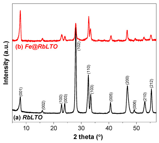 XRD pattern of the synthesized materials: (a) pristine RbLTO and (b) Fe@RbLTO-modified layered perovskite.