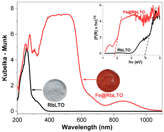 UV-Vis spectra of the pristine RbLTO and Fe@RbLTO-layered perovskites. The insert box shows the Tauc plots for the calculation of the band gap energies of both samples.