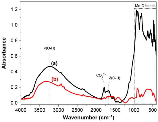 The attenuated total reflectance (ATR) and diffuse reflectance infrared Fourier transforms spectroscopy (DRIFTS) techniques provide complementary information about the structure of the catalysts. The DRIFT spectra of the RbLTO solid (Figure 5) display a band at 3227 cm−1 assigned to the stretching vibration of OH groups, which shifted toward a larger value, namely 3356 cm−1, for the Fe@RbLTO catalyst. It is noteworthy that the band intensities of the Fe2+-containing layered perovskite decreased after iron species incorporation. The band at 1671 cm−1 for both samples is attributed to the bending vibration of the O-H group in adsorbed water molecules. The asymmetric stretching vibration of CO32− was observed at 1780 cm−1. The bands observed at a wavelength lower than 950 cm−1 are due to the metal–oxygen vibrations in both samples.