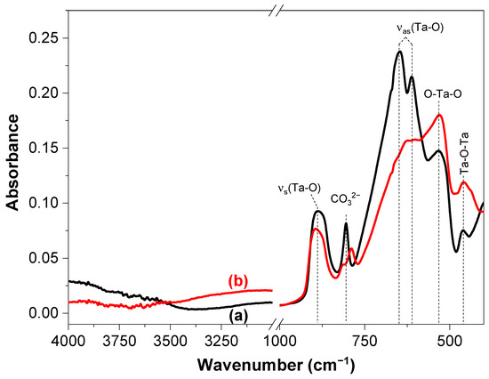 Additionally, the ATR spectra provide valuable details on the effect of Fe2+ over the RbLaTa2O7 structure (Figure 6). Vibration modes appearing at 889 cm−1, 650 cm−1, and 608 cm−1 are associated with symmetric and asymmetric stretching vibrations of Ta-O. The bands at 533 cm−1 and 458 cm−1 are related to O-Ta-O and Ta-O-Ta bridges, respectively [40,41], while the band located around 809 cm−1 involves some carbonate species [42]. The modification of the layered perovskite with FeCl2 induces a slight shifts toward lower wavenumbers (<1000 cm−1) in the ATR spectra.