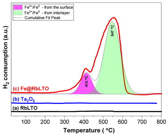 To further confirm the successful modification of the layered tantalate perovskite with Fe2+ ions, the optical properties were corroborated with those of the thermo-programmed reduction measurements (H2-TPRs). The RbLTO (Figure 7a) solid shows no reduction peaks in the temperature range of 25–800 °C, confirming that Rb+ and La3+ species are not reducible, and Ta5+ is reduced at temperatures higher than 800 °C (Figure 7b) [41]. After the introduction of Fe species (Figure 7c), two regions of reduced temperatures were perceived, suggesting a multiple-step reduction. The peak occurring at temperatures below 500 °C (max. at ≈ 412 °C) is assigned to the reduction in the Fe2+/Fe0 species localized on the surface of the catalyst. In the region with temperatures higher than 500 °C (max. at ≈ 547 °C), the Fe2+/Fe0 species localized in-between the layers of the perovskite are reduced.
