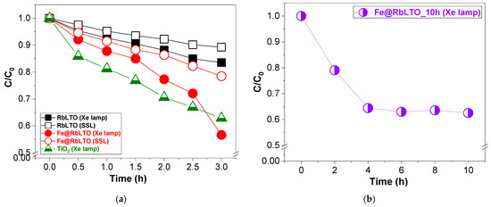 The stability of Fe@RbLTO was monitored by testing the photocatalyst under the same conditions as the above-stated experiment (25 mg·L−1, pH 6.5, and 0.050 g of catalyst) under Ar and O2 flow conditions, first for 50 min in the dark, followed by 10 h of Xe light exposure).
