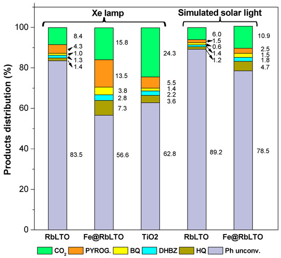 Product distribution (% µmoles) after 3 h of reaction over the RbLTO and Fe@RbLTO photocatalysts evaluated under both Xe lamp and simulated solar light conditions. TiO2 Merck is used as a reference and tested under an Xe lamp. Legend: Ph unconv = unconverted phenol, HQ = hydroquinone, DHBZ = 1,2-dihydroxi-benzene, BQ = benzoquinone, and PYROG = pyrogallol.