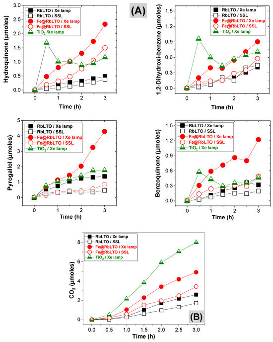 Figure 10A shows the formation of by-products over time, during the photocatalytic degradation of phenol over the TiO2 Merck reference, RbLTO, and Fe@RbLTO samples, while Figure 10B displays CO2 production following the reaction. After the exposure of Fe@RbLTO to the Xe lamp, the formation of the hydroxylated by-products (e.g., HQ, DHBZ, and PYROG) took place and gradually increased over time. At the same time, benzoquinone is formed during the reaction. The same behavior was perceived for the pristine RbLTO. When the samples are exposed to simulated solar irradiation, both photocatalysts show the formation of the same intermediate products appearing in lower quantities.