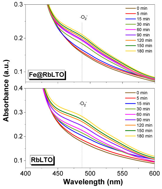 Figure 11 displays the photogeneration of the superoxide anion (•O2−) over the RbLTO and Fe@RbLTO photocatalysts.