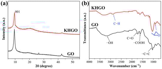 Figure 1a shows the XRD patterns of both GO and KHGO. The diffraction peak of GO appears at 2θ = 9.7°, corresponding to the (001) plane of graphene oxide []. Similarly, the diffraction peak of KHGO appears at 2θ = 9.5°, also corresponding to the (001) plane of graphene oxide. The XRD results indicate that the lattice structure of GO did not undergo significant changes during the sol-gel process used to prepare KHGO. Literature reports that surface-modified graphene oxide typically exhibits an increased interlayer spacing, causing a leftward shift of the (001) diffraction peak []. The experimental results of this study show a very slight leftward shift of the (001) diffraction peak in KHGO compared to GO.