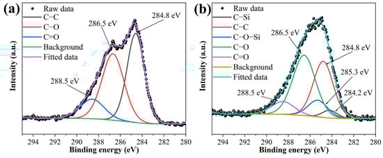 The XPS overview spectra for GO and KHGO are presented in Figure S3. In the XPS survey spectrum of GO, there are two peaks corresponding to O 1s and C 1s []. In the XPS survey spectrum of KHGO, along with the O 1s and C 1s peaks, a Si 2p peak is also observed. This result corroborates the findings from the FTIR results. The deconvolution of the C 1s peaks for GO and KHGO are shown in Figure 2a,b, respectively. In the high-resolution XPS spectrum of the C 1s peak in GO, two distinct peaks are observed, whereas in KHGO, the C 1s peak appears as a single envelope. For GO, the C 1s spectrum indicates three primary carbon chemical states: C–C, C=O, and COOH, with corresponding binding energies of 284.8 eV, 286.5 eV, and 288.5 eV []. In KHGO, the chemical states of carbon are more complex, including the three states found in GO as well as new states introduced by the chemical reaction, such as C–Si and C–O–Si, with binding energies of 284.2 eV and 285.3 eV, respectively. The XPS results further confirm that the epoxy groups from KH560 were successfully introduced onto the surface of the graphene oxide.