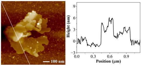The AFM image and line scan results of KHGO are shown in Figure 4. The AFM image reveals that KHGO exhibits a two-dimensional sheet structure, with overlapping sheets observed within the scanned area. In the line scan results, the intervals with a height of 0 represent the silicon wafer surface, while other intervals represent the sample surface. It is observed that the thickness in the overlapping regions of the sheets reaches 6 nm, whereas the thickness in the nonoverlapping regions is approximately 3 nm. Furthermore, the AFM image indicates that the lateral dimensions of the KHGO sheets are nearly 1 μm, suggesting an aspect ratio close to 300. The AFM results further confirm that the KHGO obtained through the sol-gel process maintains a very thin thickness and a very high aspect ratio.