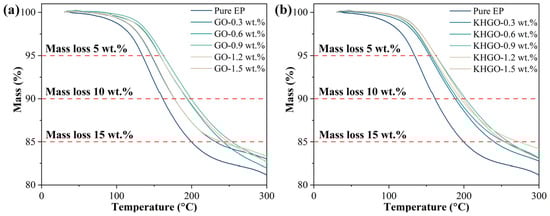 The TG curves of epoxy resin composites with varying content of GO and KHGO, measured from 30 °C to 600 °C, are shown in Figure S5a,b. In order to more clearly differentiate the TG curves of the various samples, the test results within the temperature range from 30 °C to 300 °C were plotted, as illustrated in Figure 6a,b, respectively. It can be observed from these figures that the TG curves of epoxy resin composites containing inorganic fillers shift towards higher temperatures compared to the TG curve of pure epoxy resin. This shift indicates that the thermal stability of the composites is superior to that of pure epoxy resin.