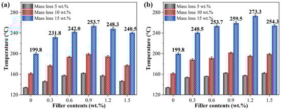 To provide a more intuitive analysis of the thermal stability of epoxy resin composites with different filler content, bar charts of the temperatures at which the mass loss in the TG curves reaches 5 wt.%, 10 wt.%, and 15 wt.% are shown in Figure 7a,b. The bar chart results indicate that, with increasing GO or KHGO content, the thermal stability of the epoxy resin composites initially increases and then decreases, exhibiting a trend similar to that of thermal conductivity. Similarly, at the same filler content, the thermal stability of KHGO/EP composites is better than that of GO/EP composites. The phenomenon of an initial increase followed by a decrease in thermal stability is also attributed to the agglomeration of the two-dimensional layers within the epoxy matrix at higher filler content.