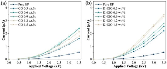 An external DC voltage was applied to GO/EP composites and KHGO/EP composites with varying filler content, and the current passing through the samples was measured, as shown in Figure 8. It can be observed that as the applied voltage increases, the current through the samples also increases; however, the current–voltage relationship is nonlinear. This nonlinear behavior can be explained using the trap theory of polymer composites. The presence of numerous traps within the polymer composites hinders the movement of charge carriers, thereby reducing the bulk conductivity of the material. As the external voltage increases, these traps gradually become filled, diminishing their obstructive effect on the movement of charge carriers. Consequently, the bulk conductivity increases with increasing external voltage, resulting in the current–voltage characteristics shown in Figure 8.