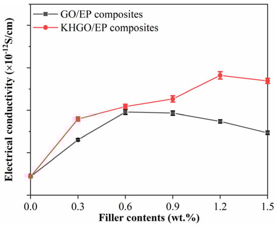 The volume electrical conductivity of composite samples with different GO and KHGO content under an external DC voltage of 3.5 kV is shown in Figure 9. The results indicate that, with the increase in filler content, both GO/EP composites and KHGO/EP composites exhibit an initial increase followed by a decrease in volume electrical conductivity. The volume electrical conductivity of pure epoxy resin is approximately 5 × 10−12 S/cm2. When the GO content increases to 0.6 wt.%, it reaches a maximum value of about 20 × 10−12 S/cm2; when the KHGO content increases to 1.2 wt.%, it reaches a maximum value of about 30 × 10−12 S/cm2. It is evident that the variation pattern of the volume electrical conductivity of composite samples with different filler content is similar to the variation pattern of thermal conductivity with filler content. This is because, compared to pure epoxy resin, the factors that cause changes in the volume electrical conductivity of composites are mainly twofold: first, the electrical conductivity of the inorganic filler itself is higher than that of the polymer matrix; second, the interface between the inorganic filler and the polymer matrix often becomes a channel for charge transfer. The reason for the decrease in volume electrical conductivity with increasing filler content beyond the critical value, similar to the change in thermal conductivity, is due to the aggregation of the 2D sheets within the polymer matrix when the filler content exceeds the critical value.