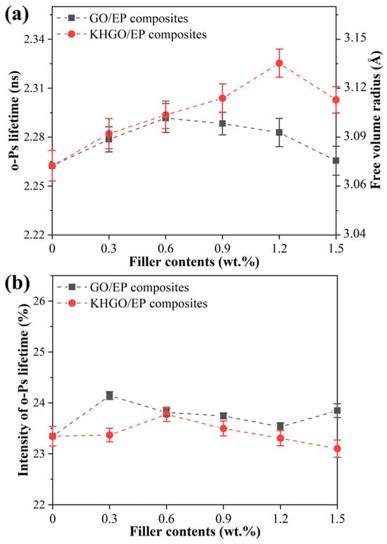 As shown in Figure 10, the positron annihilation lifetime spectra of GO/EP and KHGO/EP composites with different filler content are presented. Figure 10a shows the o-Ps annihilation lifetime with the average dimension of free volume holes calculated by o-Ps lifetime [,]. Figure 10b shows the o-Ps annihilation intensities. From Figure 10a, it can be observed that with increasing GO content, the o-Ps annihilation lifetime in GO/EP composites increases. However, when the GO content exceeds 0.6 wt.%, the o-Ps annihilation lifetime decreases with further increases in GO content. Similarly, the o-Ps annihilation lifetime in KHGO/EP composites increases with increasing KHGO content but decreases when the KHGO content exceeds 1.2 wt.%. Figure 10b indicates that the o-Ps annihilation intensity remains relatively constant with varying filler content in both GO/EP and KHGO/EP composites.
