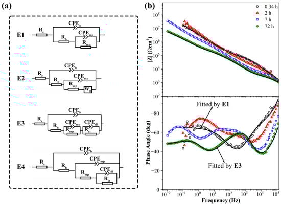 The impedance spectra of the 1.2 wt.% KHGO/EP composite samples treated with corona discharge after immersion at different times are shown in Figure 13a. In the initial immersion period, the Bode plots exhibit a noticeable decrease in phase angle at high frequencies compared to the previous three samples, while maintaining a relatively high impedance modulus at low frequencies. This result indicates a faster diffusion rate of the solution at the beginning of immersion. After 0.17 h of immersion, the Bode plots show two time constants, which can be fitted using the equivalent circuit E1. It is worth noting that although the low-frequency time constant can be fitted with a single CPE element, the curve shape suggests that a third time constant, representing the diffusion of the solution to the interface between the sample and the ITO glass, has already begun to emerge. After 3.5 h of immersion, a third time constant appears in the impedance spectra, with the low-frequency time constant exhibiting characteristics of Warburg impedance, reflecting the diffusion process of the solution. After 6 h of immersion, the Warburg impedance characteristics disappear, and the impedance spectrum can be fitted using the equivalent circuit E3, with the impedance modulus at low frequencies decreasing to around 107 Ωcm2. As the immersion time extends to 72 h, the sample continues to show a significant decrease in the high-frequency phase angle, while the low-frequency impedance spectrum falls below 107 Ωcm2, indicating a relatively high saturation water absorption level in the sample.