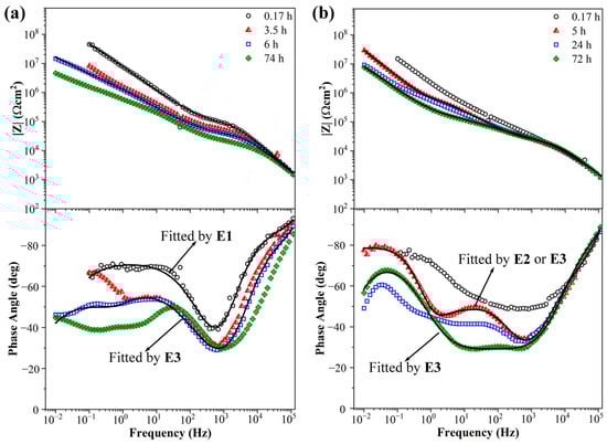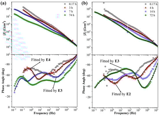 The equivalent circuits of EIS diagrams used in this article are shown in Figure 11a. The EIS diagrams of 0.3 wt.% KHGO/EP composites treated with 6 kV corona discharge for 3 h after immersion in 3.5 wt.% NaCl solution are shown in Figure 11b. At the initial stage of immersion, when the immersion time reached 0.34 h, the Bode plots revealed two time constants. The time constant between 105 Hz and 102 Hz corresponds to the sample capacitance (Cb) and the sample resistance (Rb). The time constant between 102 Hz and 10−1 Hz is more peculiar; at low frequencies, the phase angle gradually increases as the frequency decreases, exhibiting characteristics of Warburg impedance, which represents the diffusion process of the aqueous solution. However, near 10−1 Hz, the phase angle-frequency curve bends downward, leading to the use of a CPE element to fit the low-frequency time constant, as shown in equivalent circuit E1. As the immersion time increased, the phase angle at high frequencies decreased, indicating that the aqueous solution diffused into the sample, resulting in increased sample capacitance and decreased resistance. By the time the immersion reached 2 h, the Bode plots of the sample showed three time constants: the high frequency (105 Hz to 103 Hz) time constant represents the sample’s capacitance and resistance; the middle frequency (103 Hz to 102 Hz) time constant corresponds to the micropore capacitance (CPEmp) and micropore resistance (Rmp) caused by corona-induced defects within the sample; and the low-frequency time constant represents the double-layer capacitance (CPEdl) and charge transfer resistance (Rct) at the interface between the sample and the ITO glass due to the diffusion of the aqueous solution. As the immersion time extended further, the phase angle at high frequencies continued to decline, and the impedance modulus at low frequencies decreased from nearly 108 Ω·cm2 to below 107 Ω·cm2, indicating that the sample had absorbed an amount of aqueous solution. The impedance spectrum at 72 h of immersion can be fitted using either equivalent circuit E3 or E4, but E3 provides a better fit. This equivalent circuit suggests that a substantial amount of the aqueous solution accumulated at the interface between the sample and the ITO glass, resulting in a larger area of the solution layer.
