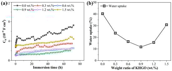 Variation of Cb of corona-treated KHGO/EP composites with different filler content as a function of immersion time (a); water uptake of KHGO/EP composites after immersion for 72 h as a function of filler content (b).