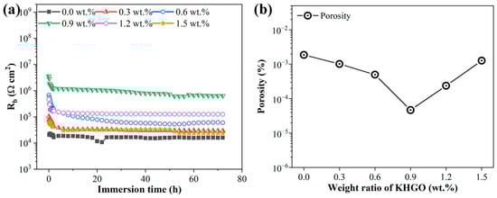 Using the equivalent circuit method, the variation of the resistance Rb with immersion time for samples with different KHGO content, after corona treatment and subsequent immersion in NaCl solution was calculated. The results are shown in Figure 15a. As the KHGO content increases, the overall Rb of the samples increases during immersion. However, once the KHGO content surpasses 0.9 wt.%, the overall Rb decreases with increasing KHGO content. The figure also shows that after 40 h of immersion, the resistance values obtained from fitting become stable over time. The porosity was calculated based on the Rb values obtained after 72 h of immersion []. The results are shown in Figure 15b. With an increase in filler content, the porosity of the samples first decreases and subsequently increases, with the composite sample containing 0.9 wt.% KHGO exhibiting the lowest porosity.