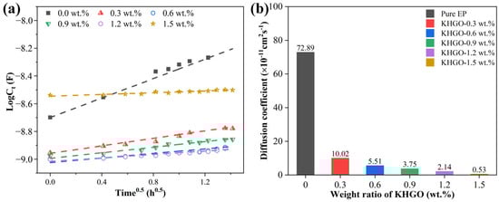Log(Ct) as a function of h0.5 of KHGO/EP composites with different filler content at the initial immersion period (a); diffusion coefficient as a function of filler content (b).