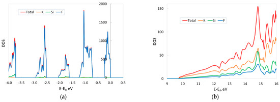 Projected and total electronic DOSs of KSF calculated with the hybrid B1WC functional and “TZVP_2012 basis set” at zero external pressure. Contributions of two K, one Si and six F atoms are shown. The zero-energy value corresponds to the Fermi level. (a) Top of valence band (negative values of abscissa axis); (b) bottom of conducting band (band gap is 9.73 eV). The number of Legendre polynomials used for the DOS expansion into series is 12 [21].