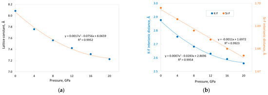 Dependences of the lattice constant (a) and the interatomic distances Si–F (right vertical axis) and K–F (left vertical axis) (b) on the external pressure with corresponding fitting (dotted lines). Calculations were performed with “TZVP_2012 basis set” and the B1WC functional.
