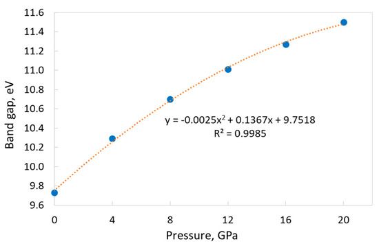 The band gap monotonically increases with increasing pressure (see Table 3), which is quite expected for a direct band gap. It is a non-linear dependence, and it can be described by a second-order polynomial (Figure 4). The increase in band gap value is 18.2% at the pressure change from 0 to 20 GPa.