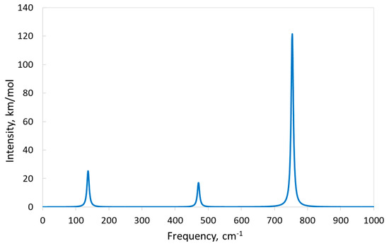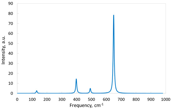 As in the case of the IR spectrum, each peak of the Raman spectrum (Figure 6) is also formed by only one vibrational mode since the Raman modes are well separated by frequency (Table 5). Interestingly, both Raman-active and silent modes are associated with vibrations of one type of atom (either K or F). Let us first consider the Raman-active modes. Relative intensities of Raman lines (they are normalized to the most intensive line) corresponding to Raman-active modes are 0.034:0.183:0.062:1 (for the lines with frequencies 131, 398, 492 and 649 cm−1, respectively). These four modes generate four peaks in the Raman spectrum (Figure 6). One peak is dominant (649 cm−1).