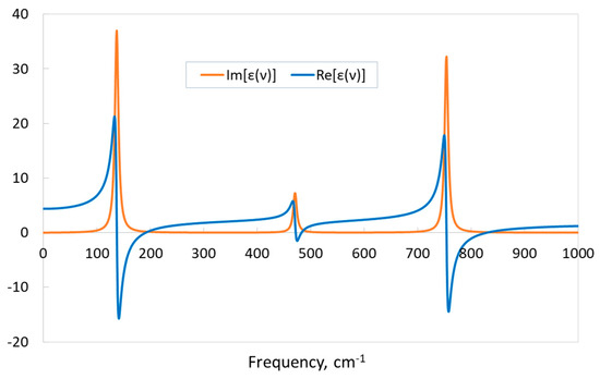 In general, permittivity is a complex function with an imaginary part that is associated with conductivity, which determines absorption. The CRYSTAL code allows the calculation of the real and imaginary parts of the complex dielectric function ε(ν) depending on the vibrational frequency ν. The maxima of the imaginary part of the dielectric function correspond to the frequencies of the TO vibrational modes. Figure 7 exhibits the real and imaginary parts of the calculated dielectric function of KSF. Three absorption bands are observed, corresponding to three IR-active vibrational modes of the material. In these regions, Im[ε(ν)] has maxima, and Re[ε(ν)] drops sharply. Note that the real part of the dielectric function at ν = 0, Re[ε(0)] is the static dielectric constant ε(0), and the presence of negative values of Re[ε(ν)] indicates that the electromagnetic waves of the corresponding frequencies will not propagate in the medium but will be reflected from its boundary.