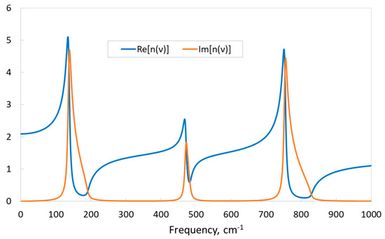 The refractive index, calculated from the high-frequency (electronic) contribution εel to the static dielectric constant, is 1.321, which is in very good agreement with the experimental data (see Table 2). A complex frequency-dependent refractive index n(ν) is used to describe the propagation of electromagnetic waves in absorbing materials. In this context, the imaginary part is responsible for attenuation, and the real part is responsible for refraction. The real and imaginary parts of such a complex refractive index of KSF are presented in Figure 8. Similar to the dielectric function, the imaginary part Im[n(ν)] has three maxima corresponding to the IR-active modes of KSF. Far from these areas, in frequency ranges where the imaginary part is close to zero and the medium is transparent for electromagnetic waves, the real part of the refractive index Re[n(ν)] increases slightly with frequency (normal dispersion). However, it decreases rapidly in the region of absorption bands (anomalous dispersion). Note that Re[n(0)] is equal to the square root of the static dielectric constant ε(0), and possible values of the real part of the refractive index below unity indicate that the phase speed of light of certain frequencies in this medium can exceed the speed of light in a vacuum.