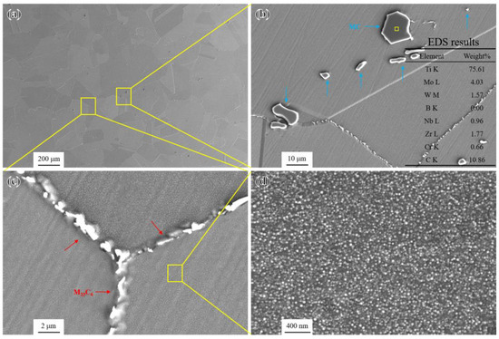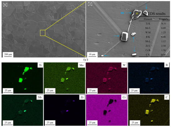 The overall microstructural characteristics of the novel alloy in the solution treatment (ST) state is shown in Figure 2a. The γ matrix was composed of equiaxed austenite grains with a grain size of approximately 150 μm (ASTM grade 3), containing numerous annealing twins and some randomly distributed blocky particles with a size of 1–10 μm, as shown in Figure 2b. According to the EDS elemental analysis results (Figure 2b) and elemental mapping (Figure 2c), the blocky particles were identified as MC carbides rich in Ti [30] and contained small amounts of carbide-forming elements such as Mo, W, and Nb. MC carbides with a melting point of about 1300 °C mainly formed during solidification and remained in the matrix because of incomplete dissolution and elimination during solution treatment [31]. In addition, the enrichment of Zr, B, and Nb was found in small-sized MC carbides, which may lead to HAZ liquation cracking in the novel alloy during subsequent welding [32,33].