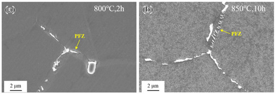 As shown in Figure 14, after long-term aging at 650–700 °C, the novel alloy also exhibited abnormal coarsening behavior at grain boundaries and formed PFZs, but it was different from that of short-term aging only occurring at 800 °C and 850 °C. Further related research will be elaborated in Section 3.4.