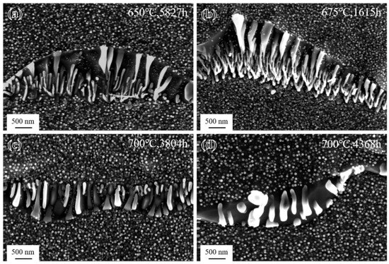 SEM images of microstructure after long-term aging: (a) 650 °C/5827 h; (b) 675 °C/1615 h; (c) 700 °C/3804 h; and (d) 700 °C/4368 h.