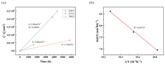 (a) A plot of the size of the γ′ phase versus long-term aging time at different temperatures and (b) the relationship between temperature (T) and the coarsening rate (k).