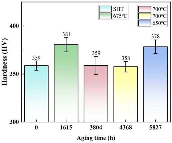 The hardness measurement results of the novel alloy after long-term aging at different temperatures are shown in Figure 17. According to the results of short-term aging, the critical size of the novel alloy was within the range of 8–16 nm. As shown in Figure 15, the average radius of γ′ particles after long-term aging at 675 °C for 1615 h was the smallest at 18 nm, exceeding the critical size. Therefore, its hardness (381 HV) was in the decreasing stage shown in Figure 10d, and the strengthening mechanism was the SCD model or the Orowan mechanism. Similarly, after long-time aging at 650 °C for 5827 h and 700 °C for 3804 h and 4368 h, the average radii of γ′ particles also exceeded the critical size, the hardness was in the decreasing stage, and the larger the average size of γ′ particles, the lower the hardness. In addition, it can also be judged that the hardness of the SHT state (359 HV) was in the rising stage, and its strengthening mechanism was the WCD model, so the average radius of γ′ particles (12 nm) had not reached the critical size. Consequently, it can be further concluded that the critical size of achieving actual peak hardness was within the range of 12–16 nm.