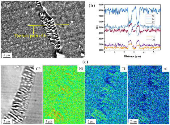 In the study of precipitates’ evolution during the high-temperature aging treatment of the novel alloy mentioned above, abnormal coarsening behavior at grain boundaries occurred during short-term aging at 800 °C and 850 °C (Figure 8), and during long-term aging at 650 °C, 675 °C, and 700 °C (Figure 14). Partial grain boundaries migrated, and precipitate-free zones (PFZs) [24,25,31,60,61,62,63] were formed. Actually, PFZs used to specifically describe the coarsened grain boundary features were not truly free of second phases. On the contrary, while a large number of previously existing fine γ′ phases disappeared, some coarsened and elongated rod-like particles were formed in these regions, so PFZs are also known as precipitate-denuded regions or coarsened zones [64]. From the EDS elemental analysis results (Figure 18b) and EPMA elemental mapping (Figure 18c), it can be seen that the rod-like particles were rich in Ni, Al, and Ti elements, suggesting that they were likely abnormally coarsened γ′ precipitates.