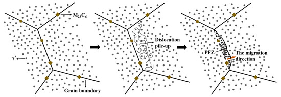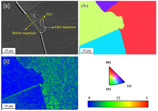 In order to clarify the formation of the PFZ, the crystal orientation and dislocation density distribution of grains on both sides of the coarsened grain boundary were investigated by EBSD. As shown in Figure 20a,b, the crystal orientation of the PFZ remained consistent with the left grain, indicating that the grain boundary migrated from the left grain to the right grain. Furthermore, as shown in Figure 20c, the kernel average misorientation (KAM) of the left grain was obviously lower than that of the right grain. Generally speaking, the larger the KAM, the higher the geometrically necessary dislocation (GND) density [65] and the higher the strain gradient and stored strain energy inside the crystal [66]. Therefore, it can be inferred that grain boundaries migrated from grains with a lower dislocation density to grains with a higher dislocation density, forming PFZs to reduce the strain energy near the grain boundaries [60,67].