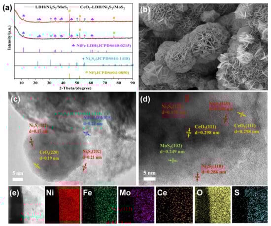 The structure of the composites was analyzed by XRD. As shown in the XRD pattern of Figure 1, the strong diffraction peaks at 44.4°, 51.8°, and 76.3° on the nickel foam (NF) substrate correspond to the (111), (200), and (220) crystal planes of NF, respectively. In the first step of the hydrothermal process, NF was inevitably sulfurized. The diffraction peaks at 21.8°, 31.1°, 37.7°, 44.4°, 49.8°, and 55.2° corresponded to the (101), (110), (003), (202), (113), and (122) crystal planes of Ni3S2 (JCPDS#No.44-1418), respectively. After the second step of hydrothermal treatment, new diffraction peaks appeared at 11.4°, 23.0°, 34.4°, 39.0°, 46.0°, 59.9°, and 61.3°, corresponding to the (003), (006), (012), (015), (018), (110), and (113) crystal planes of NiFe-LDH (JCPDS#No.40-0215). In addition, no diffraction peaks of CeO2 and MoS2 were observed in the XRD pattern, which may be due to the low content or the aggregation of MoS2 naturally accumulated during the hydrothermal process to a certain extent, resulting in poor crystallinity. Figure 1b and Figure S1 show that NiFe-LDH, LDH/Ni3S2/MoS2, and CeO2-LDH/Ni3S2/MoS2 exhibit a flower-like shape composed of nanosheet structures. The nanosheets grown on the nickel foam are relatively uniform, smooth, and densely covered. Figure S1b,e are two different sheet morphologies of LDH/Ni3S2/MoS2, showing a more dispersed growth mode than NiFe-LDH (Figure S1a,d), forming a larger flower ball. In this transition, the vertically growing and spatially interconnected network is well maintained, suggesting that this structure helps to expose more catalytically active sites, provide open channels for electrolyte accessibility, and facilitate the rapid release of bubbles. In addition, Figure S1c,f show that CeO2-modified LDH/Ni3S2/MoS2 is uniformly grown on nickel foam, and the cross-linking of nanosheets in different growth directions leads to a more open porous structure. This not only makes the catalyst have a large surface area, which is conducive to the penetration of the electrolyte, but also makes the catalyst have strong permeability. The morphological characteristics of CeO2-LDH/Ni3S2/MoS2 materials were characterized by high-resolution transmission electron microscopy. The test results shown in Figure 1c,d are high-resolution transmission images. In the HRTEM images, the lattice fringes of 0.170 nm, 0.290 nm, 0.286 nm, and 0.21 nm are from the (122), (100), (110), and (202) crystal planes of Ni3S2, respectively. The lattice fringe of 0.249 nm corresponds to the (102) crystal plane of MoS2, and the lattice fringes of 0.298 nm and 0.19 nm are from the (111) and (220) crystal planes of CeO2. In addition, there are 0.23 nm lattice fringes corresponding to the (015) crystal plane of NiFe-LDH, which confirms the successful preparation of CeO2-LDH/Ni3S2/MoS2. Figure 1c confirms the lamellar structure. The surface scanning results of the elements show that Ni, Fe, Mo, Ce, O, and S are uniformly distributed in the CeO2-LDH/Ni3S2/MoS2 catalyst (Figure 1e). The results of XRD, SEM, and TEM prove that the CeO2-LDH/Ni3S2/MoS2 hierarchical structure material is successfully synthesized.