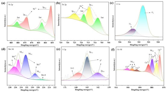 High-resolution XPS spectrogram of CeO2-LDH/Ni3S2/MoS2: (a) Ni 2p, (b) Fe 2p, (c) O 1s, (d) Mo 3d, (e) S 2p, (f) Ce 3d.