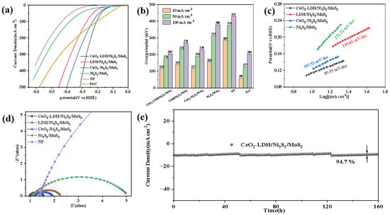 HER electrocatalytic performance in 1.0 M KOH: (a) LSV curve, (b) overpotential, (c) Tafel slope, (d) EIS spectrum, (e) durability of CeO2-LDH/Ni3S2/MoS2 determined by chronoamperometry at a current density of 10 mA cm−2.