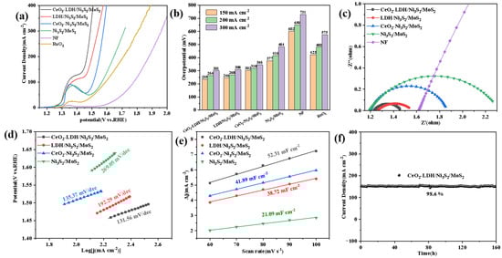 Based on the three-electrode system, the oxygen evolution performance of the catalyst was studied in an alkaline medium (1.0 M KOH). The results are shown in Figure 4a,b. There is almost no OER activity on the nickel foam substrate, but due to the three-dimensional porous structure and metal activity of nickel foam, there is an obvious oxidation peak at about 1.35 V, which proves the excellent properties of nickel foam as a skeleton material [48,49]. At a current density of 150 mA cm−2, the overpotential of CeO2-LDH/Ni3S2/MoS2 is 235 mV, lower than that of LDH/Ni3S2/MoS2 (246 mV), CeO2-Ni3S2/MoS2 (302 mV), and Ni3S2/MoS2 (377 mV), and even better than that of commercial noble metal RuO2 (423 mV). The overpotentials of Ni3S2/MoS2, CeO2-Ni3S2/MoS2, LDH/Ni3S2/MoS2, and CeO2-LDH/Ni3S2/MoS2 are 416, 484, 318, 346, 268, and 308 mV, respectively, as the current densities increased to 200 and 300 mA cm−2.