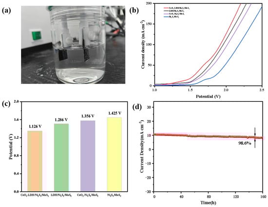 In order to evaluate the electrocatalytic performance of overall water splitting, we constructed a two-electrode electrolyzer using CeO2-LDH/Ni3S2/MoS2 as both the anode and cathode in a 1.0 M KOH solution (Figure 5a). The results from Figure 5b,c demonstrate that the CeO2-LDH/Ni3S2/MoS2||CeO2-LDH/Ni3S2/MoS2 electrolyzer achieved a cell voltage of 1.126V at 10 mA cm−2, which is significantly lower than that of LDH/Ni3S2/MoS2 (1.286 V), CeO2-Ni3S2/MoS2 (1.356 V), and Ni3S2/MoS2 (1.574 V). Moreover, Figure 5d reveals that the CeO2-LDH/Ni3S2/MoS2||CeO2-LDH/Ni3S2/MoS2 electrode maintained 98.6% of its initial activity after operating for 160 h at 10 mA cm−2. These results validate the excellent durability of the CeO2-LDH/Ni3S2/MoS2 composite for overall water splitting in an alkaline electrolyte. Additionally, the comparisons of OER and HER activities between Ni3S2/MoS2-based electrocatalysts recently reported are displayed in Table S1 and Table S2, respectively. The CeO2-LDH/Ni3S2/MoS2 electrolyzer displayed a comparable cell voltage to that of the Ni3S2/MoS2-based electrocatalysts, as shown in Table S3.