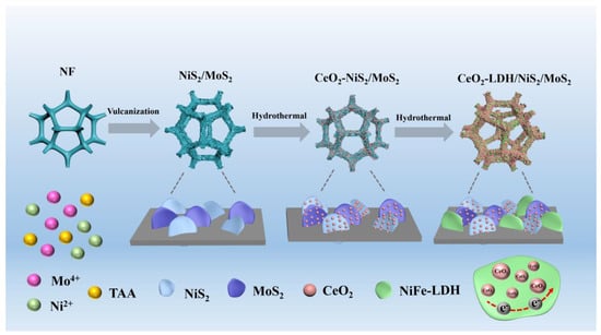 The synthesis process of CeO2-LDH/Ni3S2/MoS2 composites is shown in Scheme 1. In the first step, Ni3S2/MoS2 was prepared by one-step hydrothermal vulcanization using nickel foam as the nickel source, Na2MoO4·2H2O as the molybdenum source, and thioacetamide as the sulfur source. On this basis, CeO2-Ni3S2/MoS2 was prepared by the hydrothermal method by adding Ce(NO3)·6H2O. CeO2-LDH/Ni3S2/MoS2 was prepared by the hydrothermal method by adding Ni(NO3)2·6H2O, Fe(NO3)3·9H2O and urea.