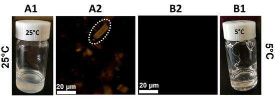 (A1,B1) Photograph, (A2,B2) polarization optical images of 10 wt% cellulose/LiCl/DMAc solution dissolved at different temperatures. The white dashed circle contains insoluble cellulose particles.