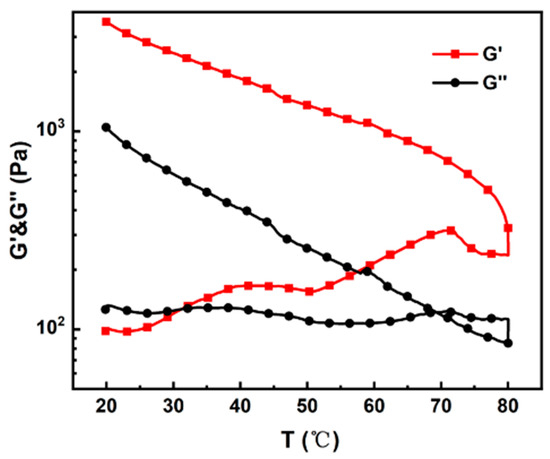 Temperature-dependent storage and loss moduli of MCC solution. Temperature was raised from 20 to 80 °C, and then decreased to 20 °C at a ramping rate of 1 °C/min.
